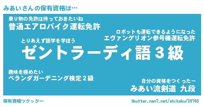みあいさんの保有資格は… とりあえず語学を学ぼう『ゼントラーディ語3級』乗り物の免許は持っておきたいね『普通エアロバイク運転免許』自分の資格をつくったー『みあい流剣道 九段』 ツクッター #保有資格ツクッター http://tkutter.nan7.net/shikaku/39765/