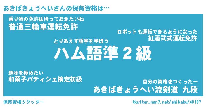 あきばきょうへいさんの保有資格は… とりあえず語学を学ぼう『ハム語準2級』乗り物の免許は持っておきたいね『普通三輪車運転免許』自分の資格をつくったー『あきばきょうへい流剣道 九段』 ツクッター #保有資格ツクッター http://tkutter.nan7.net/shikaku/40107/