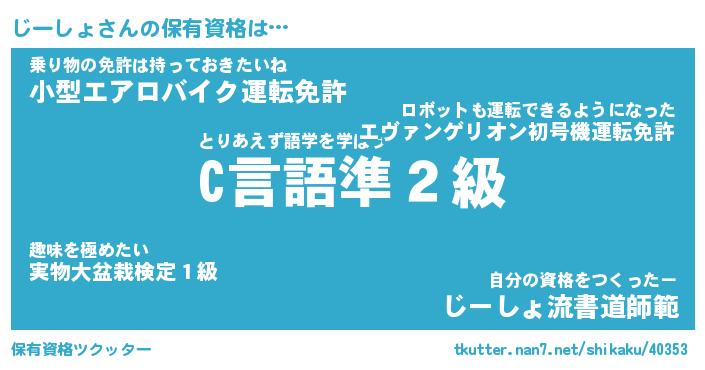 じーしょさんの保有資格は… とりあえず語学を学ぼう『C言語準2級』乗り物の免許は持っておきたいね『小型エアロバイク運転免許』自分の資格をつくったー『じーしょ流書道師範』 ツクッター #保有資格ツクッター http://tkutter.nan7.net/shikaku/40353/