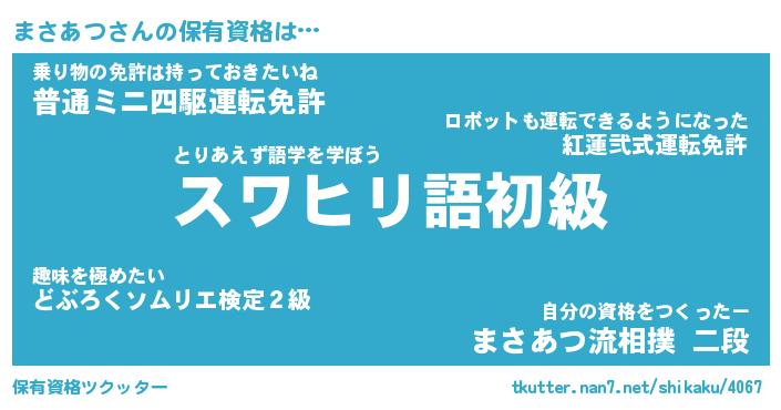 まさあつさんの保有資格は… とりあえず語学を学ぼう『スワヒリ語初級』乗り物の免許は持っておきたいね『普通ミニ四駆運転免許』自分の資格をつくったー『まさあつ流相撲 二段』 ツクッター #保有資格ツクッター http://tkutter.nan7.net/shikaku/4067/