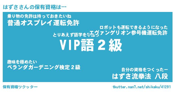 はずささんの保有資格は… とりあえず語学を学ぼう『 VIP語2級』乗り物の免許は持っておきたいね『普通オスプレイ運転免許』自分の資格をつくったー『はずさ流拳法 八段』 ツクッター #保有資格ツクッター http://tkutter.nan7.net/shikaku/41291/