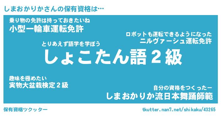 しまおかりかさんの保有資格は… とりあえず語学を学ぼう『しょこたん語2級』乗り物の免許は持っておきたいね『小型一輪車運転免許』自分の資格をつくったー『しまおかりか流日本舞踊師範』 ツクッター #保有資格ツクッター http://tkutter.nan7.net/shikaku/43265/