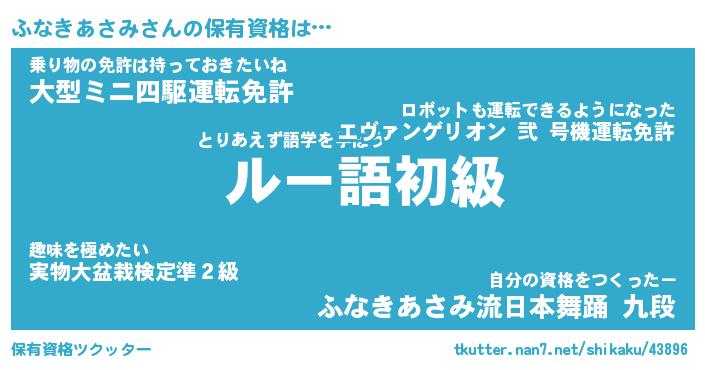 ふなきあさみさんの保有資格は… とりあえず語学を学ぼう『 ルー語初級』乗り物の免許は持っておきたいね『大型ミニ四駆運転免許』自分の資格をつくったー『ふなきあさみ流日本舞踊 九段』 ツクッター #保有資格ツクッター http://tkutter.nan7.net/shikaku/43896/