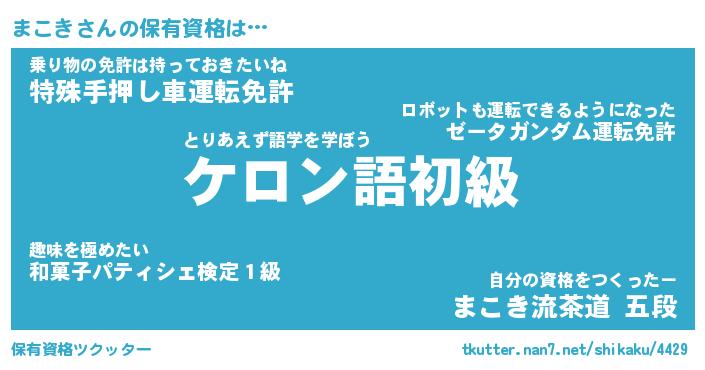 まこきさんの保有資格は… とりあえず語学を学ぼう『ケロン語初級』乗り物の免許は持っておきたいね『特殊手押し車運転免許』自分の資格をつくったー『まこき流茶道 五段』 ツクッター #保有資格ツクッター http://tkutter.nan7.net/shikaku/4429/