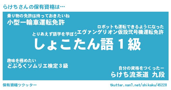 らけちさんの保有資格は… とりあえず語学を学ぼう『しょこたん語1級』乗り物の免許は持っておきたいね『小型一輪車運転免許』自分の資格をつくったー『らけち流茶道 九段』 ツクッター #保有資格ツクッター http://tkutter.nan7.net/shikaku/45228/