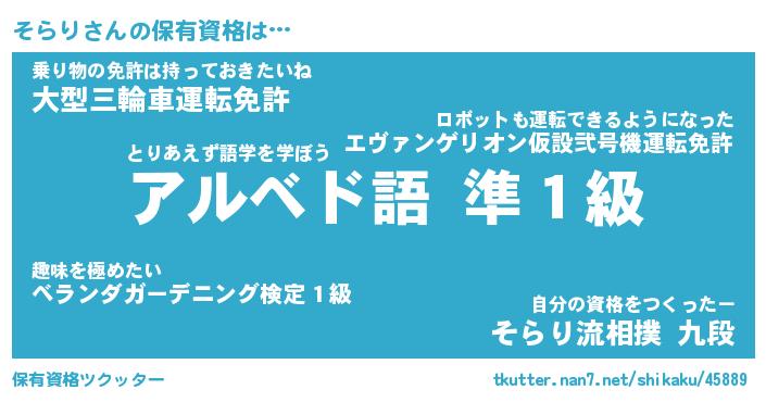 そらりさんの保有資格は… とりあえず語学を学ぼう『アルベド語 準1級』乗り物の免許は持っておきたいね『大型三輪車運転免許』自分の資格をつくったー『そらり流相撲 九段』 ツクッター #保有資格ツクッター http://tkutter.nan7.net/shikaku/45889/