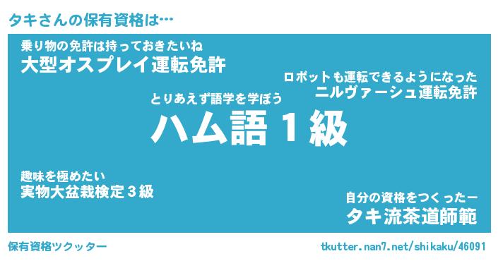 タキさんの保有資格は… とりあえず語学を学ぼう『ハム語1級』乗り物の免許は持っておきたいね『大型オスプレイ運転免許』自分の資格をつくったー『タキ流茶道師範』 ツクッター #保有資格ツクッター http://tkutter.nan7.net/shikaku/46091/