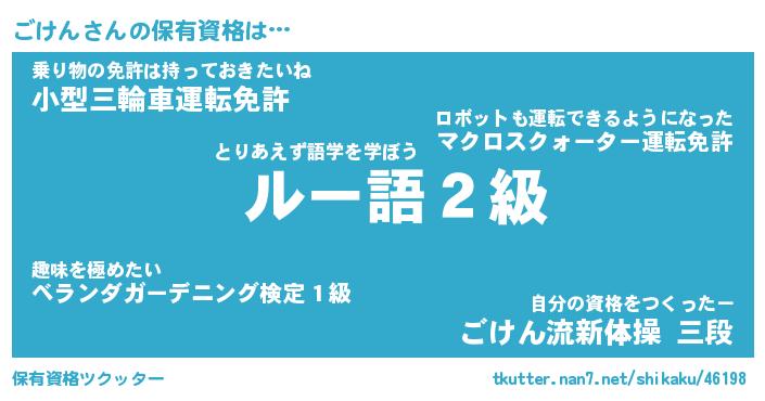 ごけんさんの保有資格は… とりあえず語学を学ぼう『 ルー語2級』乗り物の免許は持っておきたいね『小型三輪車運転免許』自分の資格をつくったー『ごけん流新体操 三段』 ツクッター #保有資格ツクッター http://tkutter.nan7.net/shikaku/46198/