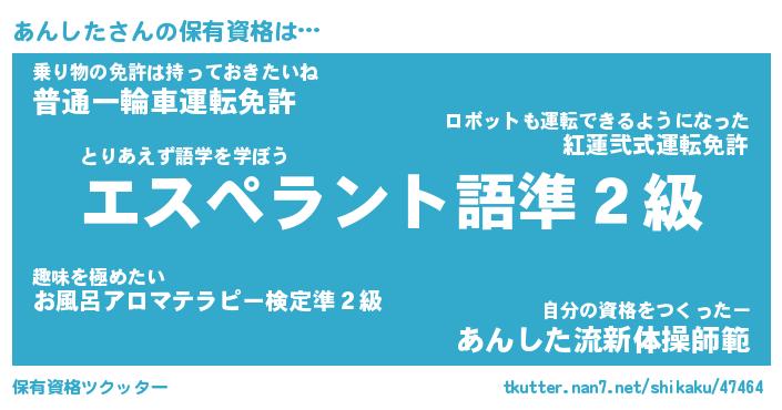 あんしたさんの保有資格は… とりあえず語学を学ぼう『エスペラント語準2級』乗り物の免許は持っておきたいね『普通一輪車運転免許』自分の資格をつくったー『あんした流新体操師範』 ツクッター #保有資格ツクッター http://tkutter.nan7.net/shikaku/47464/