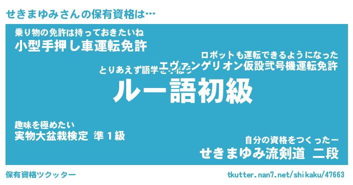 せきまゆみさんの保有資格は… とりあえず語学を学ぼう『 ルー語初級』乗り物の免許は持っておきたいね『小型手押し車運転免許』自分の資格をつくったー『せきまゆみ流剣道 二段』 ツクッター #保有資格ツクッター http://tkutter.nan7.net/shikaku/47663/