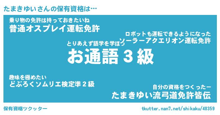 たまきゆいさんの保有資格は… とりあえず語学を学ぼう『お通語3級』乗り物の免許は持っておきたいね『普通オスプレイ運転免許』自分の資格をつくったー『たまきゆい流弓道免許皆伝』 ツクッター #保有資格ツクッター http://tkutter.nan7.net/shikaku/48359/