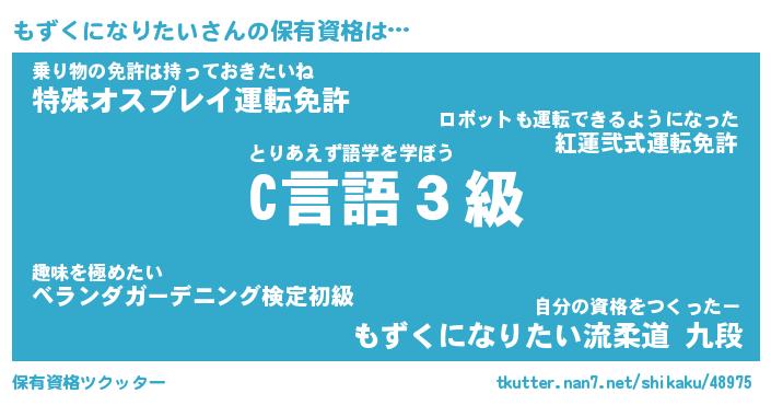 もずくになりたいさんの保有資格は… とりあえず語学を学ぼう『C言語3級』乗り物の免許は持っておきたいね『特殊オスプレイ運転免許』自分の資格をつくったー『もずくになりたい流柔道 九段』 ツクッター #保有資格ツクッター http://tkutter.nan7.net/shikaku/48975/