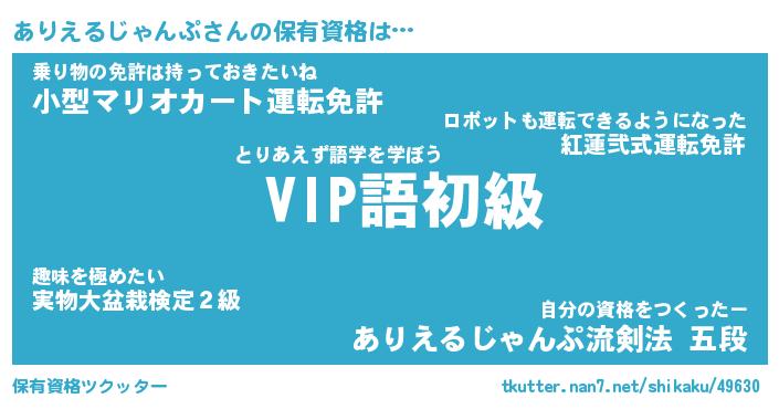 ありえるじゃんぷさんの保有資格は… とりあえず語学を学ぼう『 VIP語初級』乗り物の免許は持っておきたいね『小型マリオカート運転免許』自分の資格をつくったー『ありえるじゃんぷ流剣法 五段』 ツクッター #保有資格ツクッター http://tkutter.nan7.net/shikaku/49630/