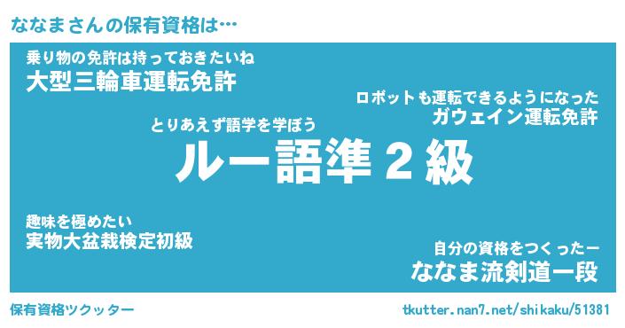 ななまさんの保有資格は… とりあえず語学を学ぼう『 ルー語準2級』乗り物の免許は持っておきたいね『大型三輪車運転免許』自分の資格をつくったー『ななま流剣道一段』 ツクッター #保有資格ツクッター http://tkutter.nan7.net/shikaku/51381/