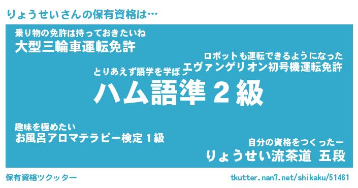 りょうせいさんの保有資格は… とりあえず語学を学ぼう『ハム語準2級』乗り物の免許は持っておきたいね『大型三輪車運転免許』自分の資格をつくったー『りょうせい流茶道 五段』 ツクッター #保有資格ツクッター http://tkutter.nan7.net/shikaku/51461/