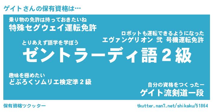 ゲイトさんの保有資格は… とりあえず語学を学ぼう『ゼントラーディ語2級』乗り物の免許は持っておきたいね『特殊セグウェイ運転免許』自分の資格をつくったー『ゲイト流剣道一段』 ツクッター #保有資格ツクッター http://tkutter.nan7.net/shikaku/51864/