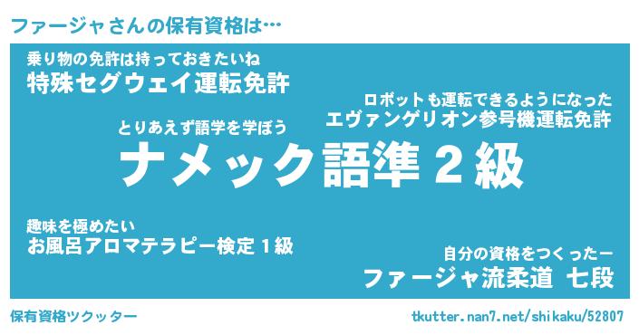 ファージャさんの保有資格は… とりあえず語学を学ぼう『ナメック語準2級』乗り物の免許は持っておきたいね『特殊セグウェイ運転免許』自分の資格をつくったー『ファージャ流柔道 七段』 ツクッター #保有資格ツクッター http://tkutter.nan7.net/shikaku/52807/