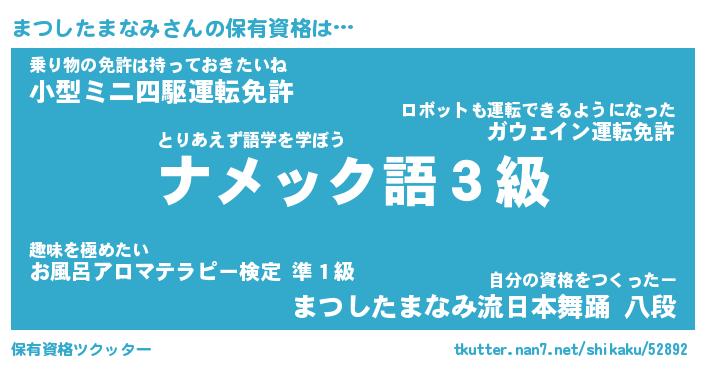 | 恥ずかしいあだ名 | 『プリティーまつしたまなみ』『まつちん』 |