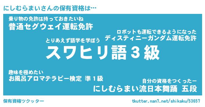 | ヒーロー風カッコイイあだ名 | 『スーパーニシムラマイ』『天弓騎士ニシ』 |