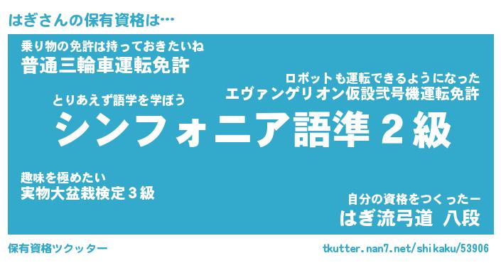 はぎさんの保有資格は… とりあえず語学を学ぼう『シンフォニア語準2級』乗り物の免許は持っておきたいね『普通三輪車運転免許』自分の資格をつくったー『はぎ流弓道 八段』 ツクッター #保有資格ツクッター http://tkutter.nan7.net/shikaku/53906/