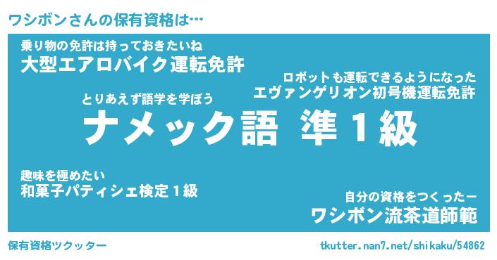 ワシボンさんの保有資格は… とりあえず語学を学ぼう『ナメック語 準1級』乗り物の免許は持っておきたいね『大型エアロバイク運転免許』自分の資格をつくったー『ワシボン流茶道師範』 ツクッター #保有資格ツクッター http://tkutter.nan7.net/shikaku/54862/