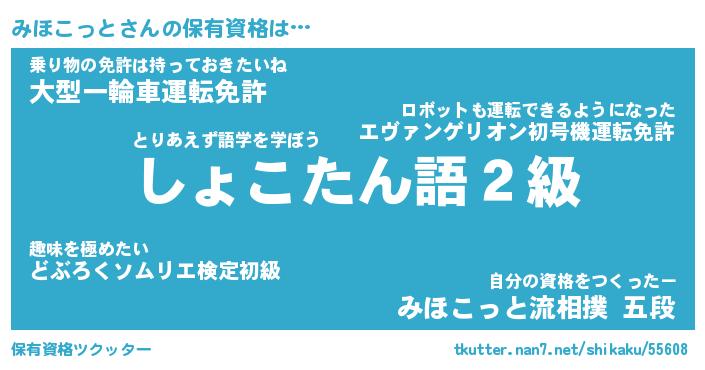 みほこっとさんの保有資格は… とりあえず語学を学ぼう『しょこたん語2級』乗り物の免許は持っておきたいね『大型一輪車運転免許』自分の資格をつくったー『みほこっと流相撲 五段』 ツクッター #保有資格ツクッター http://tkutter.nan7.net/shikaku/55608/