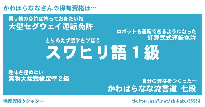 かわはらななさんの保有資格は… とりあえず語学を学ぼう『スワヒリ語1級』乗り物の免許は持っておきたいね『大型セグウェイ運転免許』自分の資格をつくったー『かわはらなな流書道 七段』 ツクッター #保有資格ツクッター http://tkutter.nan7.net/shikaku/55984/