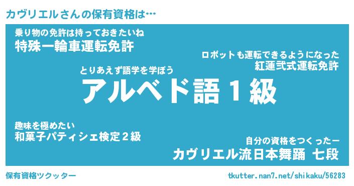カヴリエルさんの保有資格は… とりあえず語学を学ぼう『アルベド語1級』乗り物の免許は持っておきたいね『特殊一輪車運転免許』自分の資格をつくったー『カヴリエル流日本舞踊 七段』 ツクッター #保有資格ツクッター http://tkutter.nan7.net/shikaku/56283/