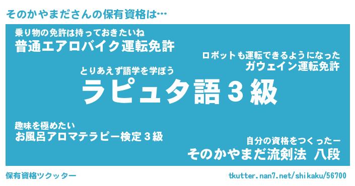 そのかやまださんの保有資格は… とりあえず語学を学ぼう『ラピュタ語3級』乗り物の免許は持っておきたいね『普通エアロバイク運転免許』自分の資格をつくったー『そのかやまだ流剣法 八段』 ツクッター #保有資格ツクッター http://tkutter.nan7.net/shikaku/56700/