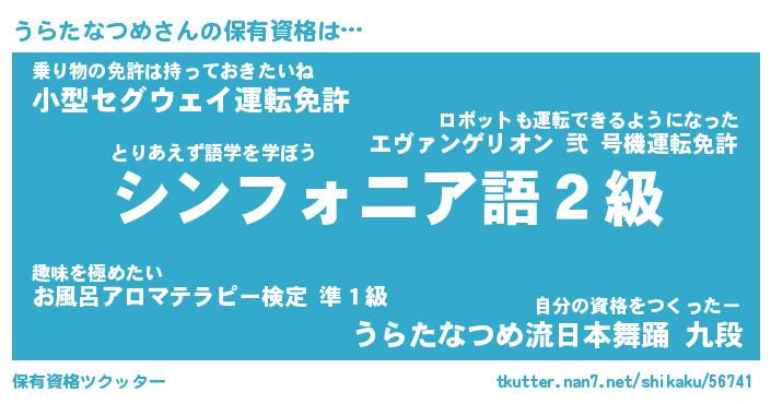 うらたなつめさんの保有資格は… とりあえず語学を学ぼう『シンフォニア語2級』乗り物の免許は持っておきたいね『小型セグウェイ運転免許』自分の資格をつくったー『うらたなつめ流日本舞踊 九段』 ツクッター #保有資格ツクッター http://tkutter.nan7.net/shikaku/56741/