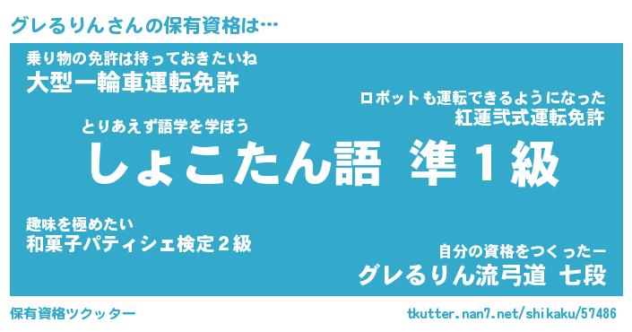 グレるりんさんの保有資格は… とりあえず語学を学ぼう『しょこたん語 準1級』乗り物の免許は持っておきたいね『大型一輪車運転免許』自分の資格をつくったー『グレるりん流弓道 七段』 ツクッター #保有資格ツクッター http://tkutter.nan7.net/shikaku/57486/
