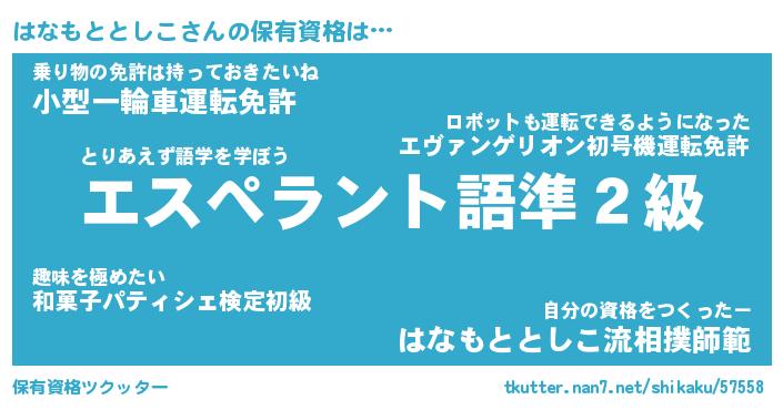 はなもととしこさんの保有資格は… とりあえず語学を学ぼう『エスペラント語準2級』乗り物の免許は持っておきたいね『小型一輪車運転免許』自分の資格をつくったー『はなもととしこ流相撲師範』 ツクッター #保有資格ツクッター http://tkutter.nan7.net/shikaku/57558/