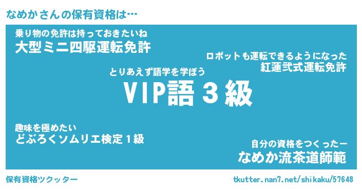 なめかさんの保有資格は… とりあえず語学を学ぼう『 VIP語3級』乗り物の免許は持っておきたいね『大型ミニ四駆運転免許』自分の資格をつくったー『なめか流茶道師範』 ツクッター #保有資格ツクッター http://tkutter.nan7.net/shikaku/57648/