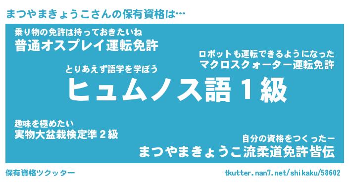 まつやまきょうこさんの保有資格は… とりあえず語学を学ぼう『ヒュムノス語1級』乗り物の免許は持っておきたいね『普通オスプレイ運転免許』自分の資格をつくったー『まつやまきょうこ流柔道免許皆伝』 ツクッター #保有資格ツクッター http://tkutter.nan7.net/shikaku/58602/