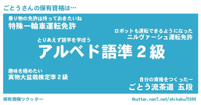 ごとうさんの保有資格は… とりあえず語学を学ぼう『アルベド語準2級』乗り物の免許は持っておきたいね『特殊一輪車運転免許』自分の資格をつくったー『ごとう流茶道 五段』 ツクッター #保有資格ツクッター http://tkutter.nan7.net/shikaku/5990/