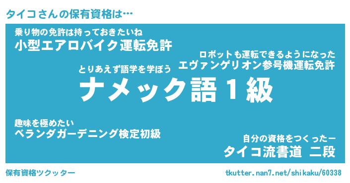 タイコさんの保有資格は… とりあえず語学を学ぼう『ナメック語1級』乗り物の免許は持っておきたいね『小型エアロバイク運転免許』自分の資格をつくったー『タイコ流書道 二段』 ツクッター #保有資格ツクッター http://tkutter.nan7.net/shikaku/60338/