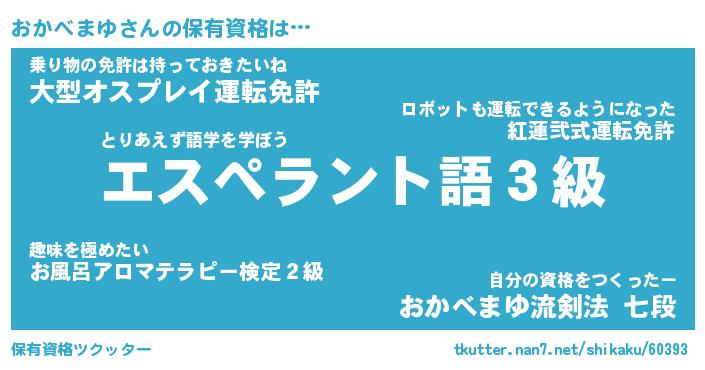 おかべまゆさんの保有資格は… とりあえず語学を学ぼう『エスペラント語3級』乗り物の免許は持っておきたいね『大型オスプレイ運転免許』自分の資格をつくったー『おかべまゆ流剣法 七段』 ツクッター #保有資格ツクッター http://tkutter.nan7.net/shikaku/60393/