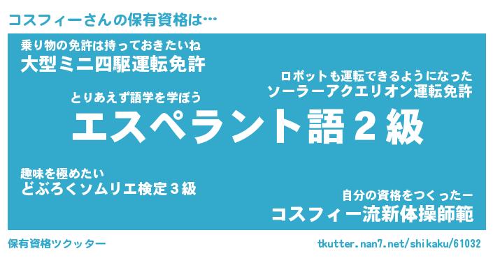 | ファンタジー風あだ名 | 『コスフェル』『エターナルコスフィーー』 |