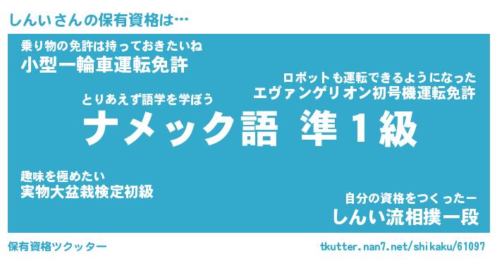 しんいさんの保有資格は… とりあえず語学を学ぼう『ナメック語 準1級』乗り物の免許は持っておきたいね『小型一輪車運転免許』自分の資格をつくったー『しんい流相撲一段』 ツクッター #保有資格ツクッター http://tkutter.nan7.net/shikaku/61097/