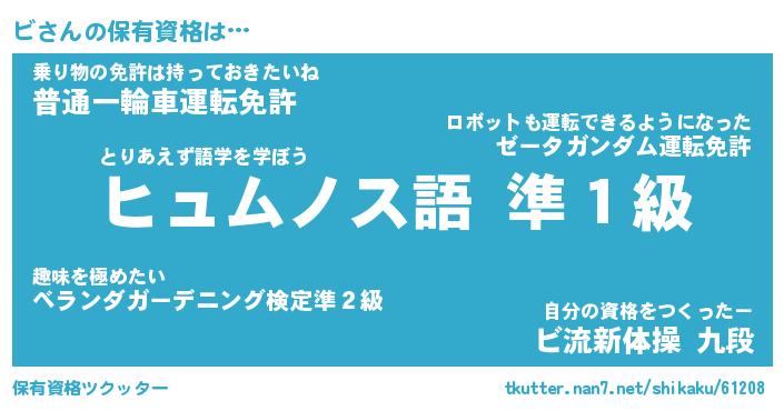 ビさんの保有資格は… とりあえず語学を学ぼう『ヒュムノス語 準1級』乗り物の免許は持っておきたいね『普通一輪車運転免許』自分の資格をつくったー『ビ流新体操 九段』 ツクッター #保有資格ツクッター http://tkutter.nan7.net/shikaku/61208/