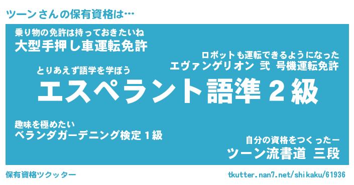 ツーンさんの保有資格は… とりあえず語学を学ぼう『エスペラント語準2級』乗り物の免許は持っておきたいね『大型手押し車運転免許』自分の資格をつくったー『ツーン流書道 三段』 ツクッター #保有資格ツクッター http://tkutter.nan7.net/shikaku/61936/