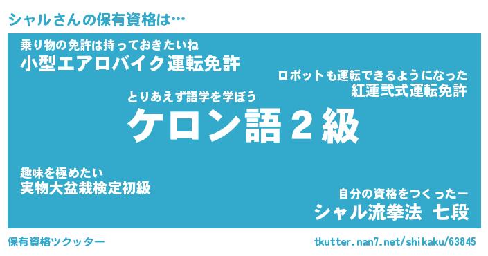 シャルさんの保有資格は… とりあえず語学を学ぼう『ケロン語2級』乗り物の免許は持っておきたいね『小型エアロバイク運転免許』自分の資格をつくったー『シャル流拳法 七段』 ツクッター #保有資格ツクッター http://tkutter.nan7.net/shikaku/63845/