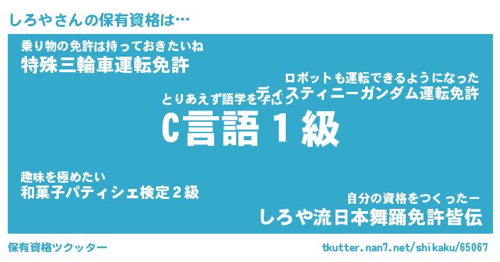 しろやさんの保有資格は… とりあえず語学を学ぼう『C言語1級』乗り物の免許は持っておきたいね『特殊三輪車運転免許』自分の資格をつくったー『しろや流日本舞踊免許皆伝』 ツクッター #保有資格ツクッター http://tkutter.nan7.net/shikaku/65067/