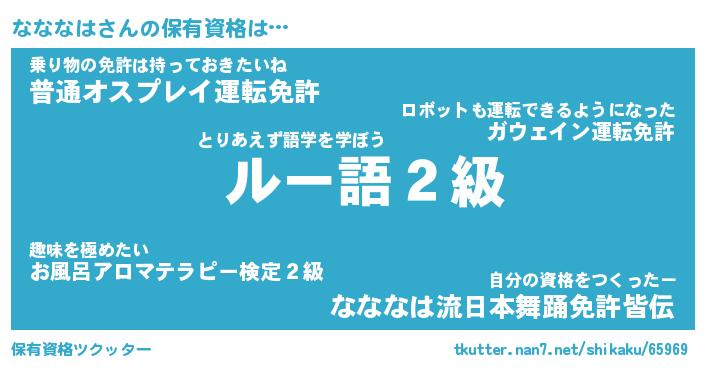 なななはさんの保有資格は… とりあえず語学を学ぼう『 ルー語2級』乗り物の免許は持っておきたいね『普通オスプレイ運転免許』自分の資格をつくったー『なななは流日本舞踊免許皆伝』 ツクッター #保有資格ツクッター http://tkutter.nan7.net/shikaku/65969/