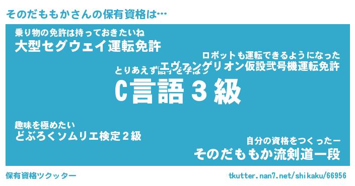 そのだももかさんの保有資格は… とりあえず語学を学ぼう『C言語3級』乗り物の免許は持っておきたいね『大型セグウェイ運転免許』自分の資格をつくったー『そのだももか流剣道一段』 ツクッター #保有資格ツクッター http://tkutter.nan7.net/shikaku/66956/