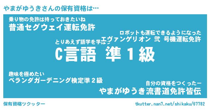 やまがゆうきさんの保有資格は… とりあえず語学を学ぼう『C言語 準1級』乗り物の免許は持っておきたいね『普通セグウェイ運転免許』自分の資格をつくったー『やまがゆうき流書道免許皆伝』 ツクッター #保有資格ツクッター http://tkutter.nan7.net/shikaku/67782/