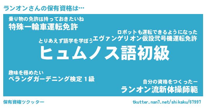 ランオンさんの保有資格は… とりあえず語学を学ぼう『ヒュムノス語初級』乗り物の免許は持っておきたいね『特殊一輪車運転免許』自分の資格をつくったー『ランオン流新体操師範』 ツクッター #保有資格ツクッター http://tkutter.nan7.net/shikaku/67997/