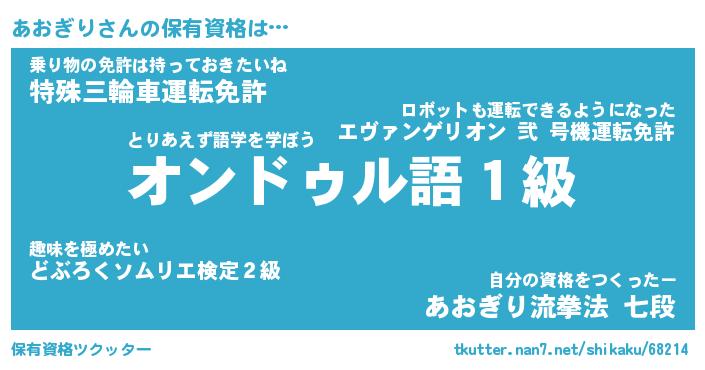 あおぎりさんの保有資格は… とりあえず語学を学ぼう『オンドゥル語1級』乗り物の免許は持っておきたいね『特殊三輪車運転免許』自分の資格をつくったー『あおぎり流拳法 七段』 ツクッター #保有資格ツクッター http://tkutter.nan7.net/shikaku/68214/