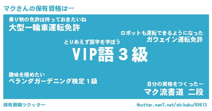 マクさんの保有資格は… とりあえず語学を学ぼう『 VIP語3級』乗り物の免許は持っておきたいね『大型一輪車運転免許』自分の資格をつくったー『マク流書道 二段』 ツクッター #保有資格ツクッター http://tkutter.nan7.net/shikaku/69613/