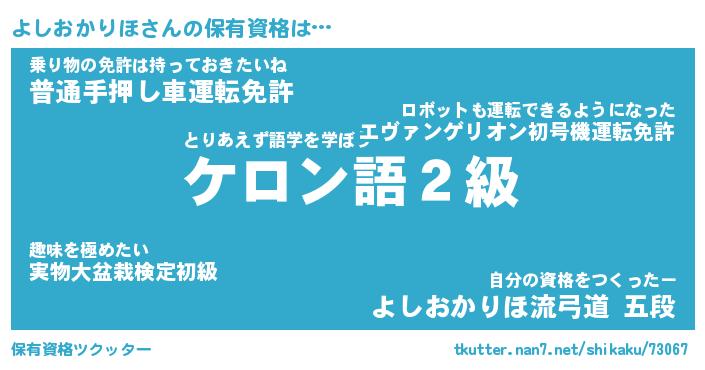 よしおかりほさんの保有資格は… とりあえず語学を学ぼう『ケロン語2級』乗り物の免許は持っておきたいね『普通手押し車運転免許』自分の資格をつくったー『よしおかりほ流弓道 五段』 ツクッター #保有資格ツクッター http://tkutter.nan7.net/shikaku/73067/